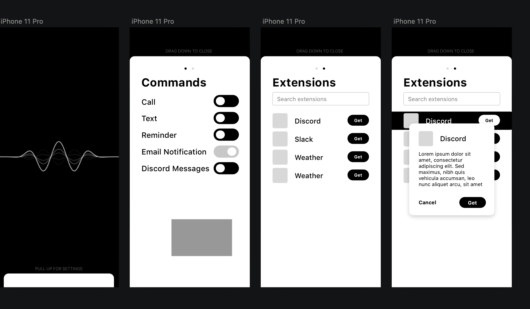 The first page takes in voice input and recognizes commands via speech to text, while animating based on the decibal level of the input. While the Commands page lets you enable/disable commands as you see fit. The extensions page allows you to search for new extensions that were released and created by other users of the app, allowing for an infinite amount of possiblity.