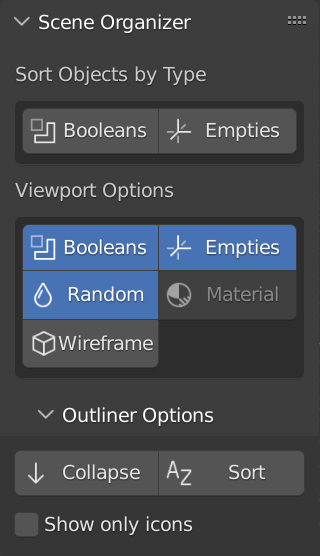 Scene Organizer Features Create new collections and sort based on object type Quick viewport overlay options including: Toggle all boolean and empty objects visabilty Collapse and sort collections in outliner Installation Navigate to releases Download latest zip Navigate to addons in Blender preferences Install the zip from your computer Screenshots FAQ Error: No module named "SceneOrganizer" installed Restart Blender Enable "SceneOrganizer" in preferences -> addons