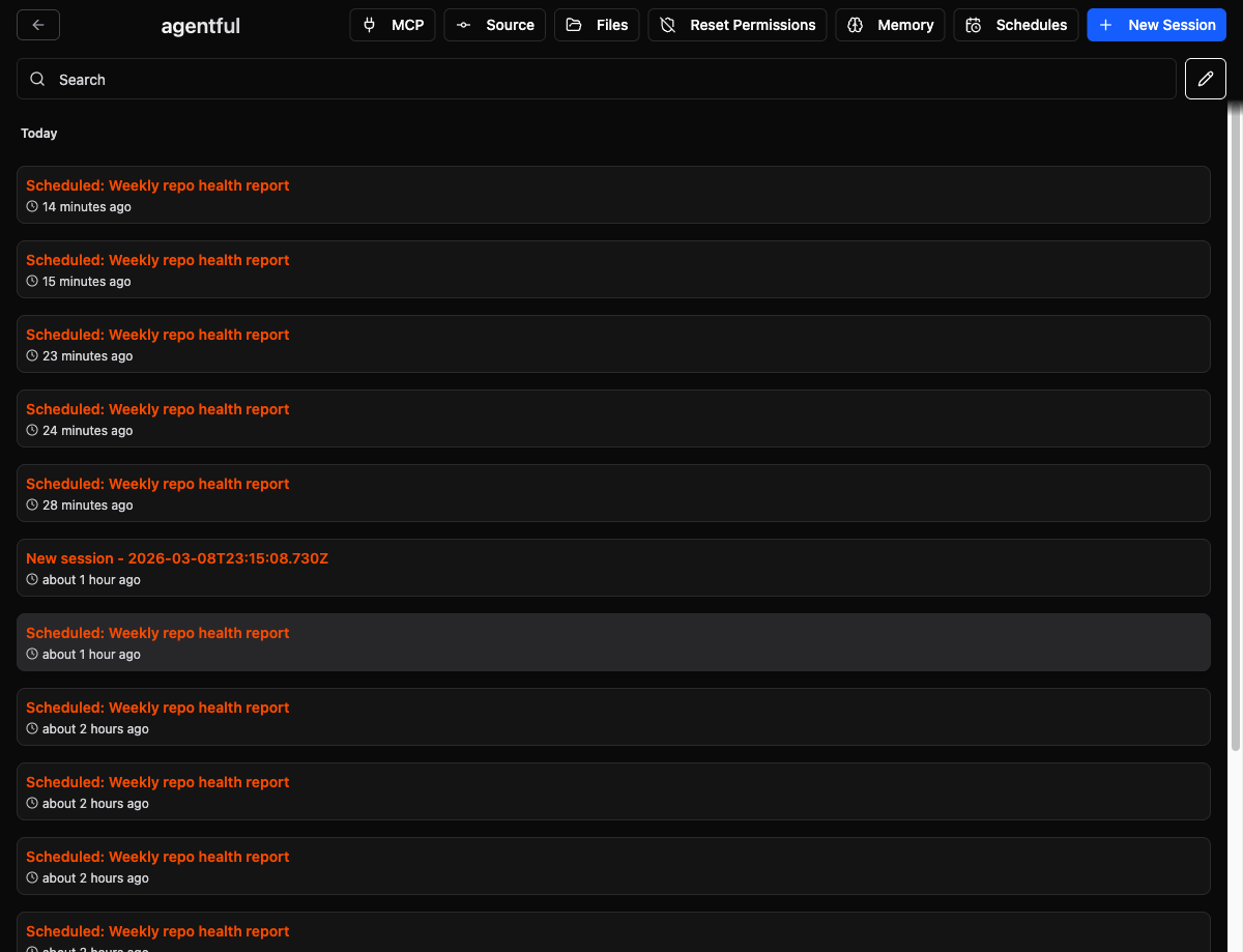 The entry point sits alongside the existing repo actions, and scheduled runs show up in the same session stream as everything else.