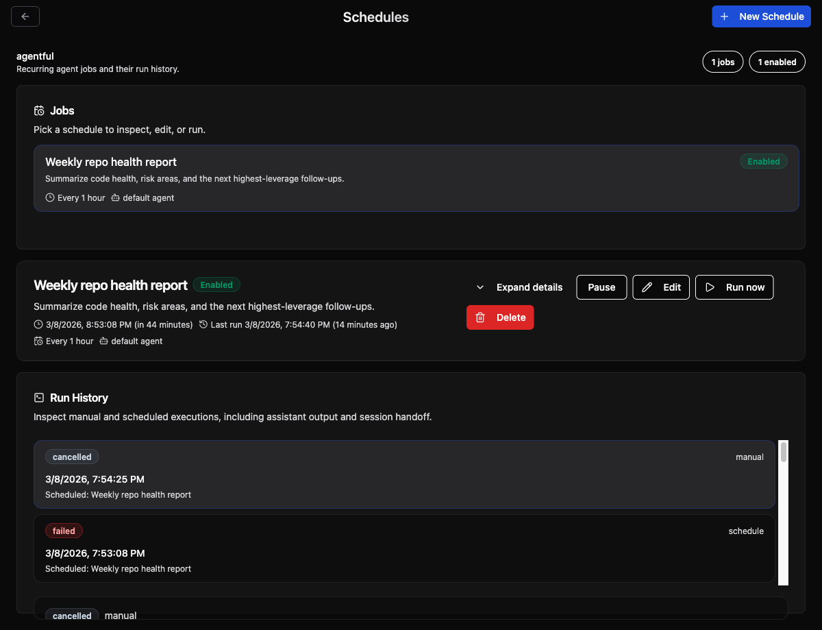 Schedulesentry point from the repo detail pageRun nowreturns quickly instead of waiting on the full assistant response200 OKwith an empty body before the session finishesValidation