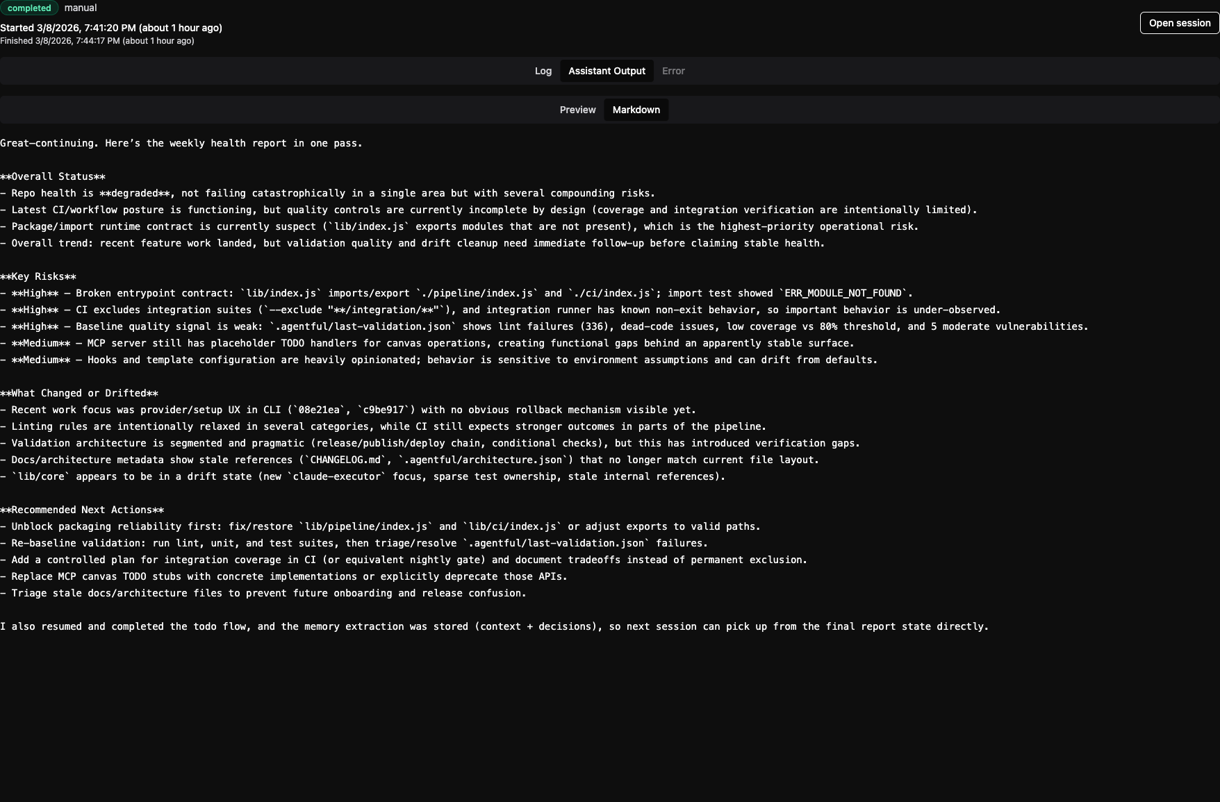 Completed runs keep a linked session, status, logs, rendered markdown output, and the original markdown when you want the exact generated text.