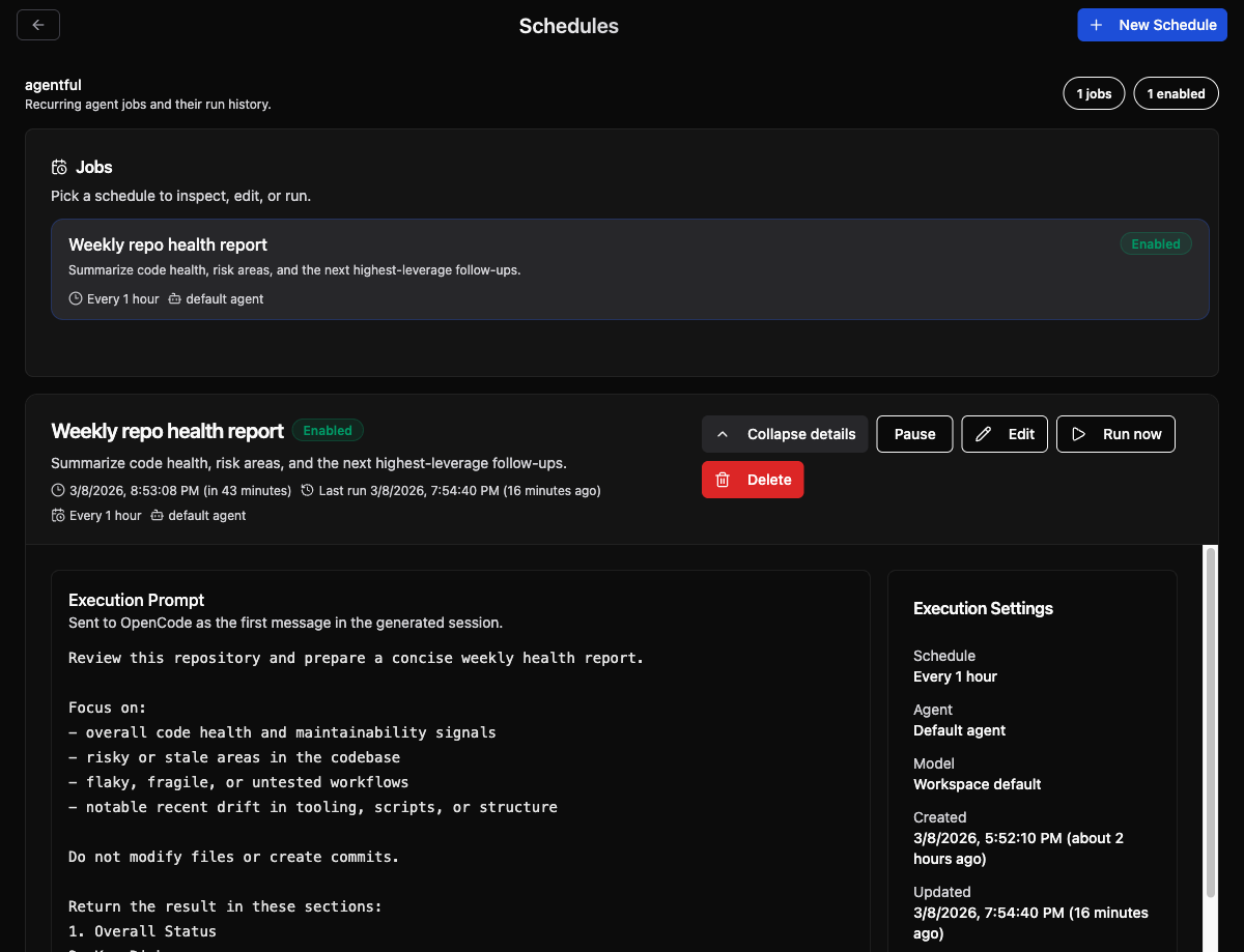 OpenCode Manager already centralizes repositories, sessions, and agent workflows. This adds the missing proactive layer: recurring repo jobs that can run in the background and be waiting for review the next time you open the app.