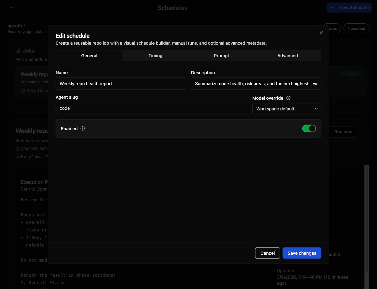 Adds repo-scoped schedules for recurring agent jobs, including shared Zod types/schemas, backend scheduling + run persistence, and a new frontend “Schedules” dashboard + docs to expose and manage the feature.