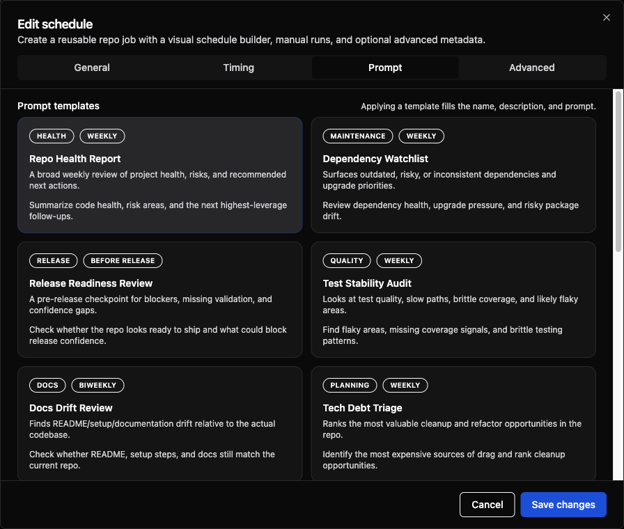 That makes workflows like morning repo briefs, dependency watchlists, release-readiness checks, and recurring code-health reviews feel native to the existing product instead of bolted on as a separate automation tool.