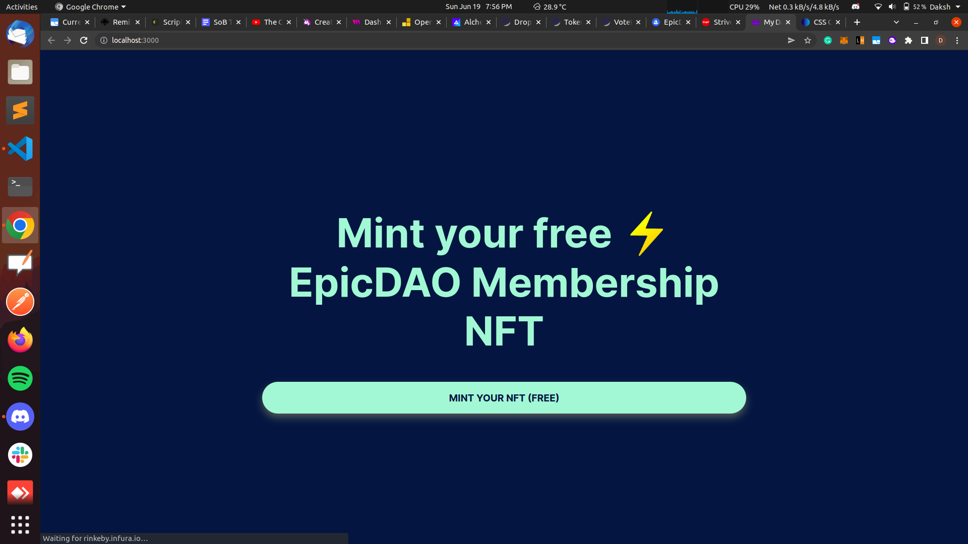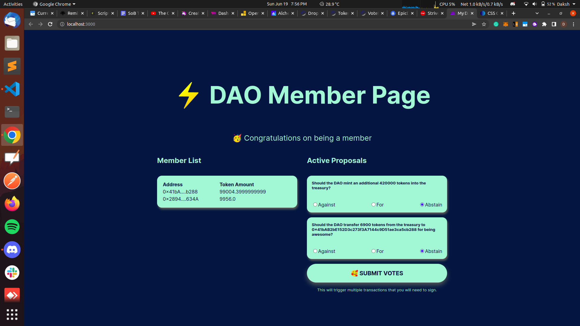 ✅ built a dapp that lets people connect their wallet, get an NFT, see a DAO Dashboard where they can see other members + actually vote on proposals that are executed directly by your governance contract.