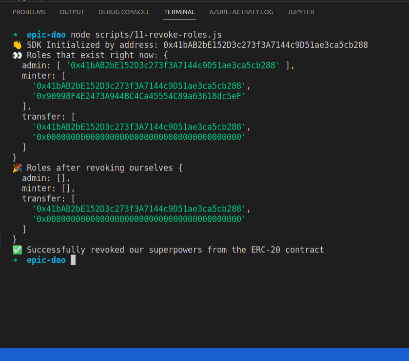 That way, only the voting contract is able to mint new tokens. We can do by making changes to scripts/11-revoke-roles.js