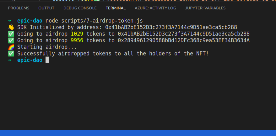 YOOOO. You just did an airdrop, hell yes!! In my case, you can see I have 6 unique members in my DAO and they all received the airdrop. In your case, it’ll likely be just you right now! Feel free to run this script again as more members join.