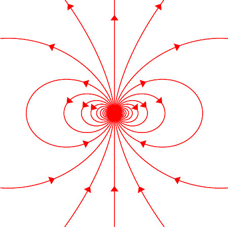 The magnetic field is regarded as being created by a magnetic dipole. The direction of the magnetic dipole moment is assumed to be the same as the rotation axis and the strength is (according to own estimations) set to 10^23 A*m². The magnetic field created by such a magnetic dipole moment looks like this (By Bdushaw (Own work) [CC BY-SA 4.0 (http://creativecommons.org/licenses/by-sa/4.0)], via Wikimedia Commons):