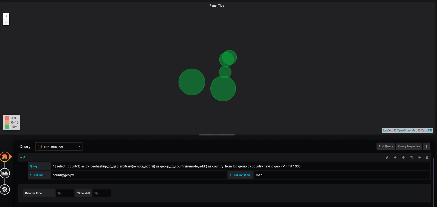 * | select count(1) as pv ,geohash(ip_to_geo(arbitrary(remote_addr))) as geo,ip_to_country(remote_addr) as country from log group by country having geo <>'' limit 1000