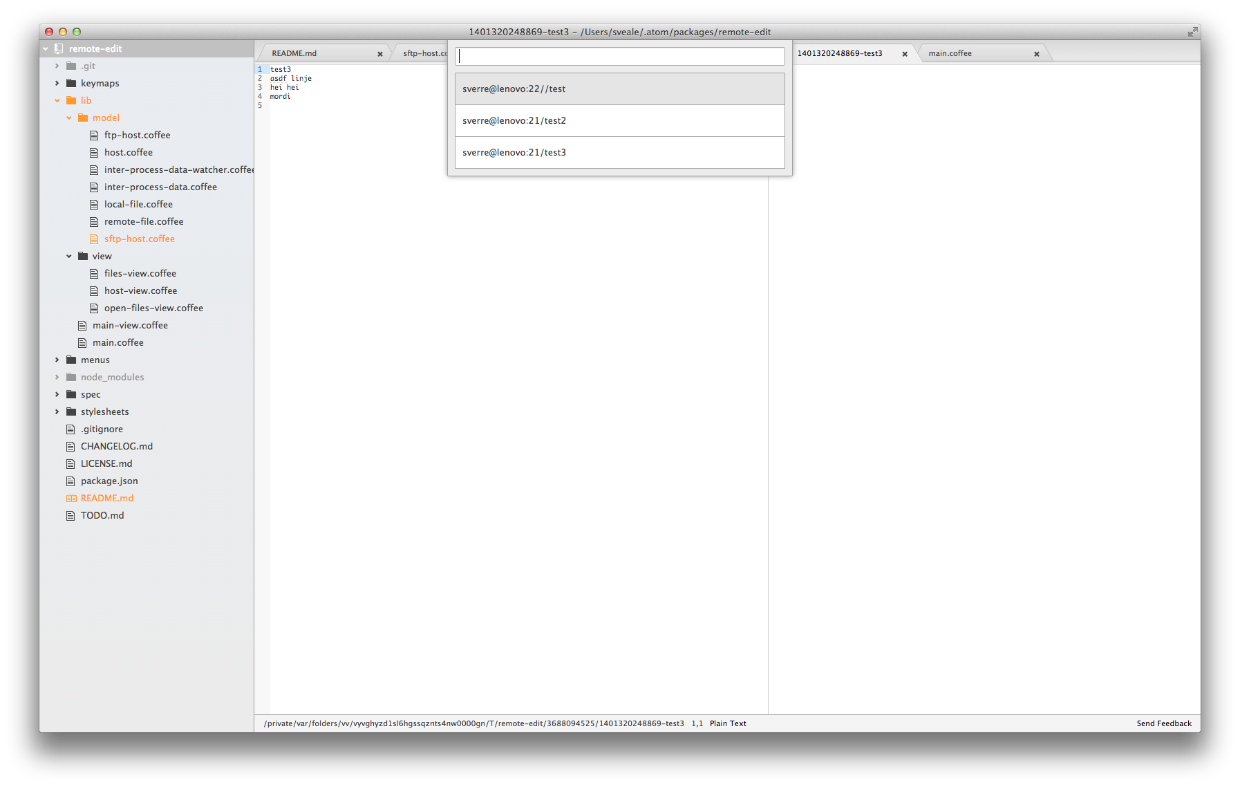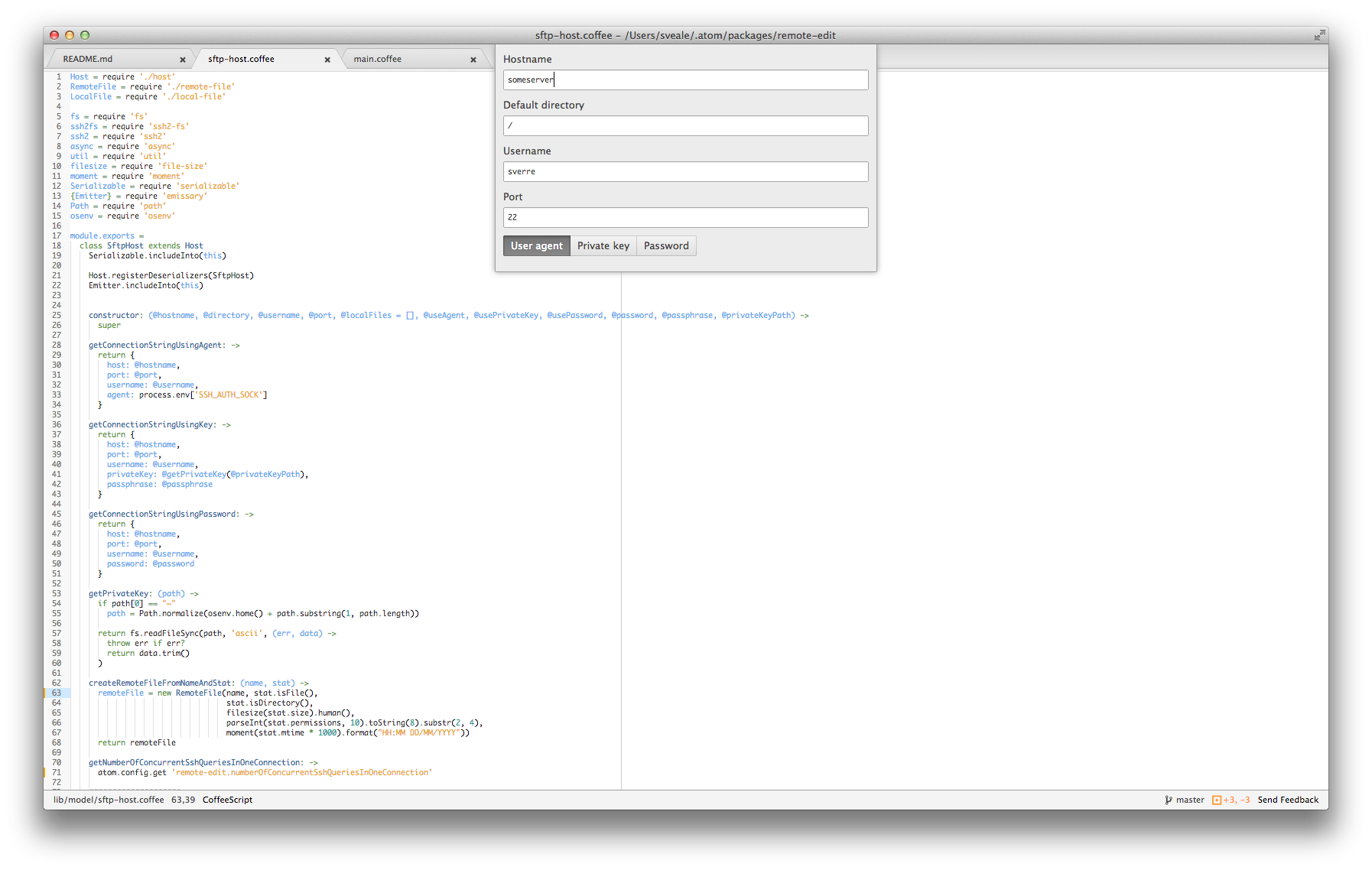 remote-edit for atom.io Atom package to browse and edit remote files using FTP and SFTP. Features See changelog Settings Usage Commands Add a new host Browse hosts Browse files Open files