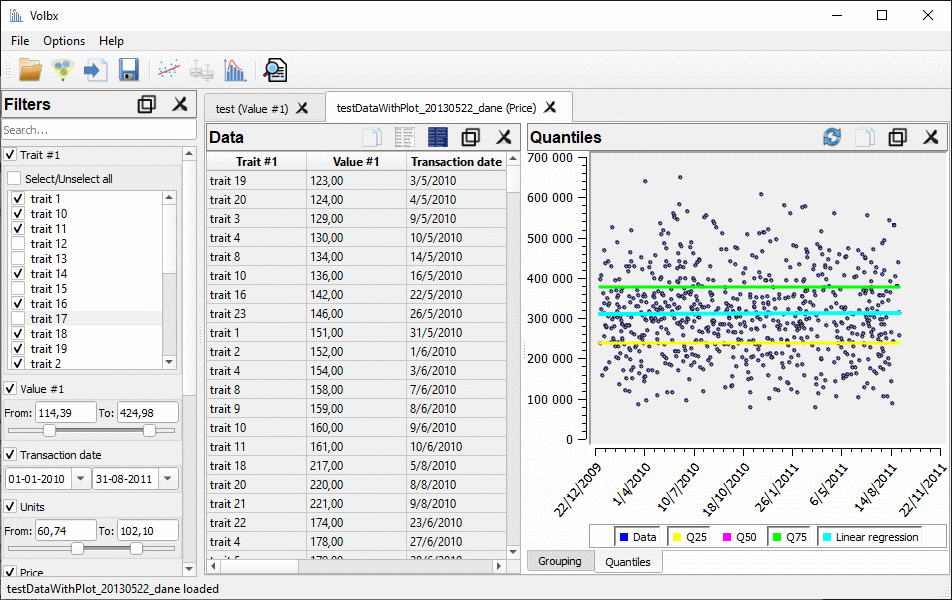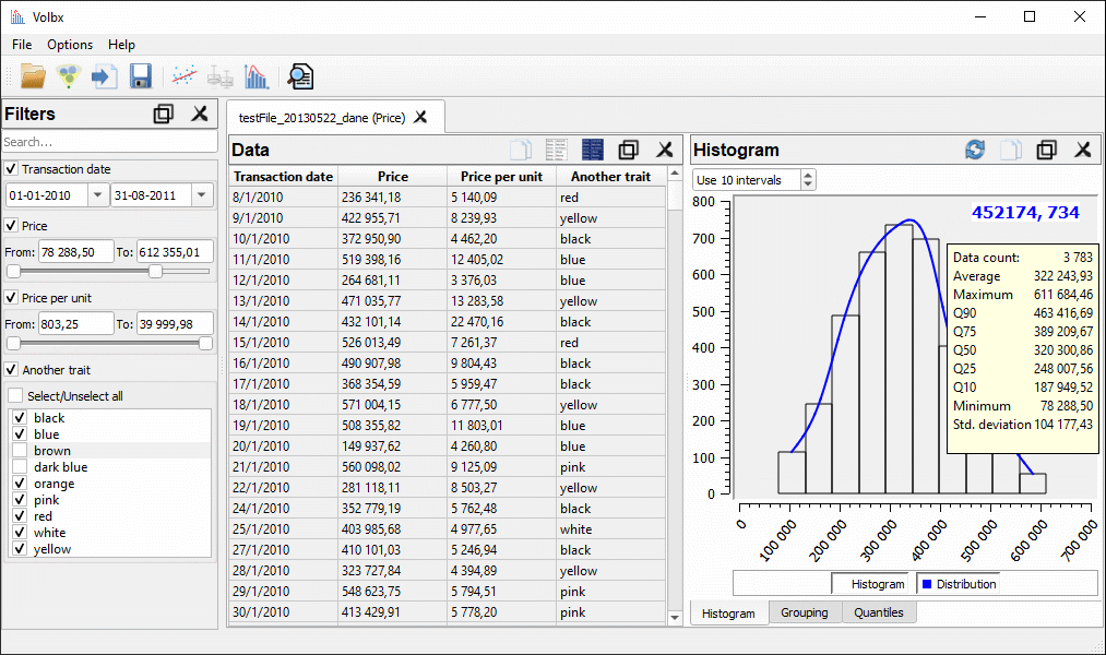 - visualize data - multiple types of built-in diagrams (histogram, grouping, linear regression, quantiles) which adjusts dynamically according to user actions,
