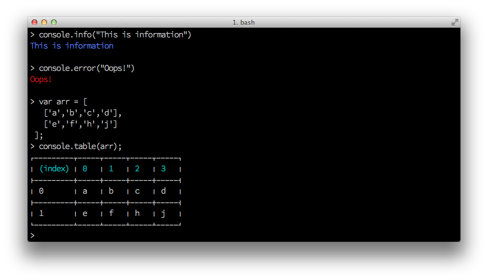 $ npm install better-consolebetter-console is a drop-in replacement for node's default console which